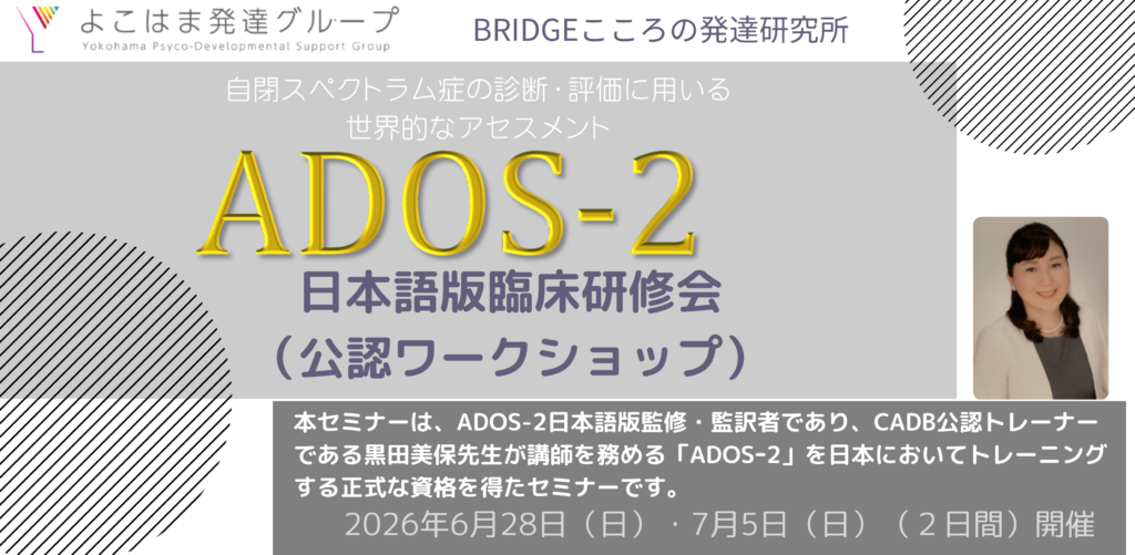 6/28・7/5開催 ADOS-2日本語版 臨床研修会(オンラインによる公認ワークショップ)2日間 2026 2/16 よこはま発達グループ 2026年2月16日 ADOS-2(Autism Diagnostic Observation Schedule Second Edition)は、自閉症診断のゴールドスタンダードとして位置づけられているツールの1つです。 詳しくはこちら FacebookX よこはま発達グループ セミナー URLをコピーしました!